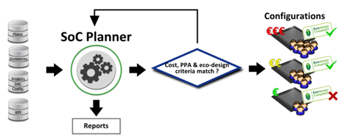 SoC Planner innovation will drastically reduce this number to a set of relevant configurations in line with the scope of the designer specifications at early stages. This will significantly reduce the number of design cycles (iterations of the product development) and, consequently, development cost savings. An eco-design dimension is also taken into account to enable precise measurement of environmental impact at the start of a new system-on-chip design project, and the minimization of this criterion in the same way as the usual performance criteria (consumption, time, surface area).