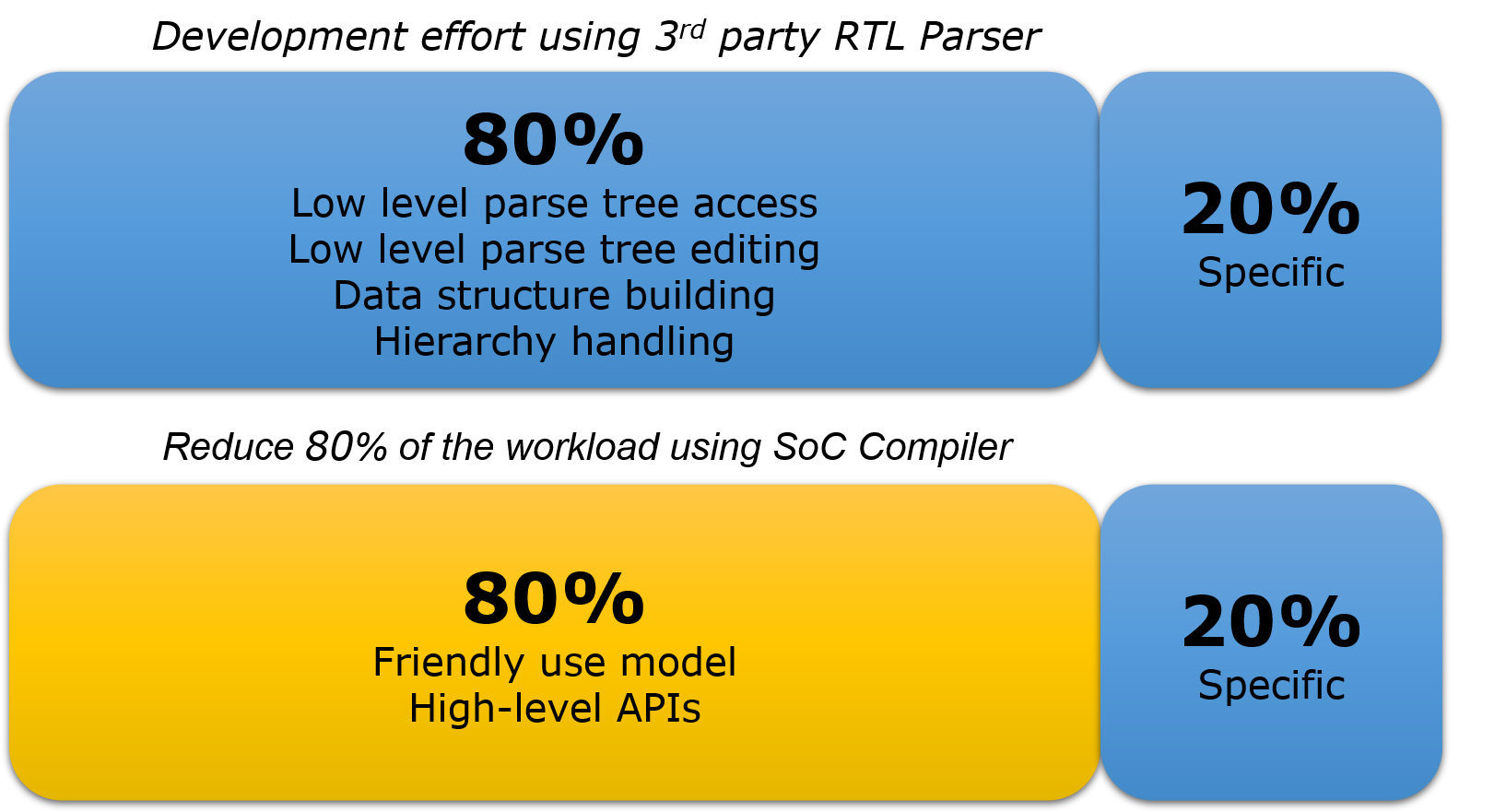 To make the pre-synthesis SoC integration process efficient and cost-effective, Defacto’s SoC Compiler provides a rich set of APIs which are accessible to a large number of users: RTL designers, architects, design verification engineers, power and clock management teams, DFT engineers and back-end engineers.